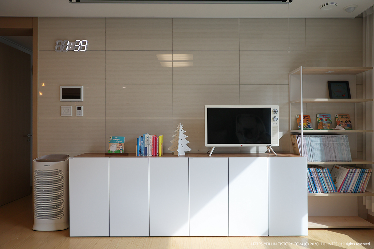 이사를 하고나니 요즘 인테리어로 많이 활용되고 있는 LED 벽시계가 설치되어 있었다. 아트월에 타공 후 매립까지 해서 LED 벽시계의 선이 외부로 너저분 하게 보이지 않아 더욱 깔끔한 상태였다.