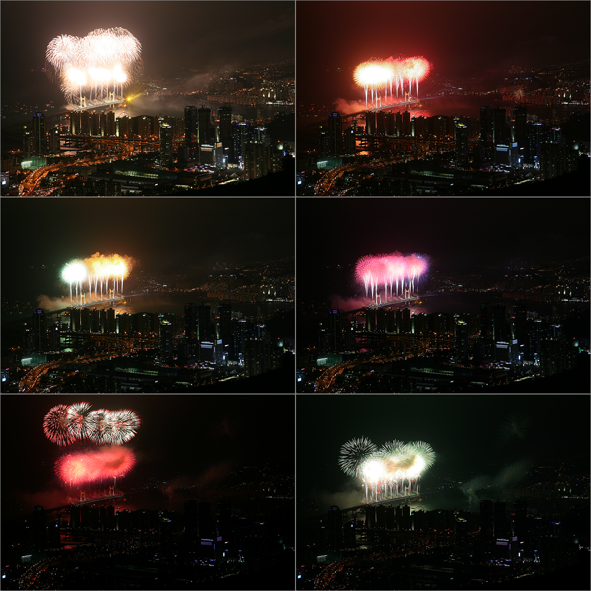 아래는 그 예를 든 사진들인데, 사진을 찍자마자 이건 아니다 싶어 셔터를 바로 닫았다. 조리개와 감도를 조절하기에는 빛의 강도가 너무 들쭉 날쭉 해서 하나를 담으면 다른 하나는 포기해야 하는 그런 상황이 연출되었다. 그리고 불꽃에 조리개와 감도를 맞추면 도심이 너무 어두워지는 결과로 이어지기 때문에 쉽지 않은 촬영이 된다.