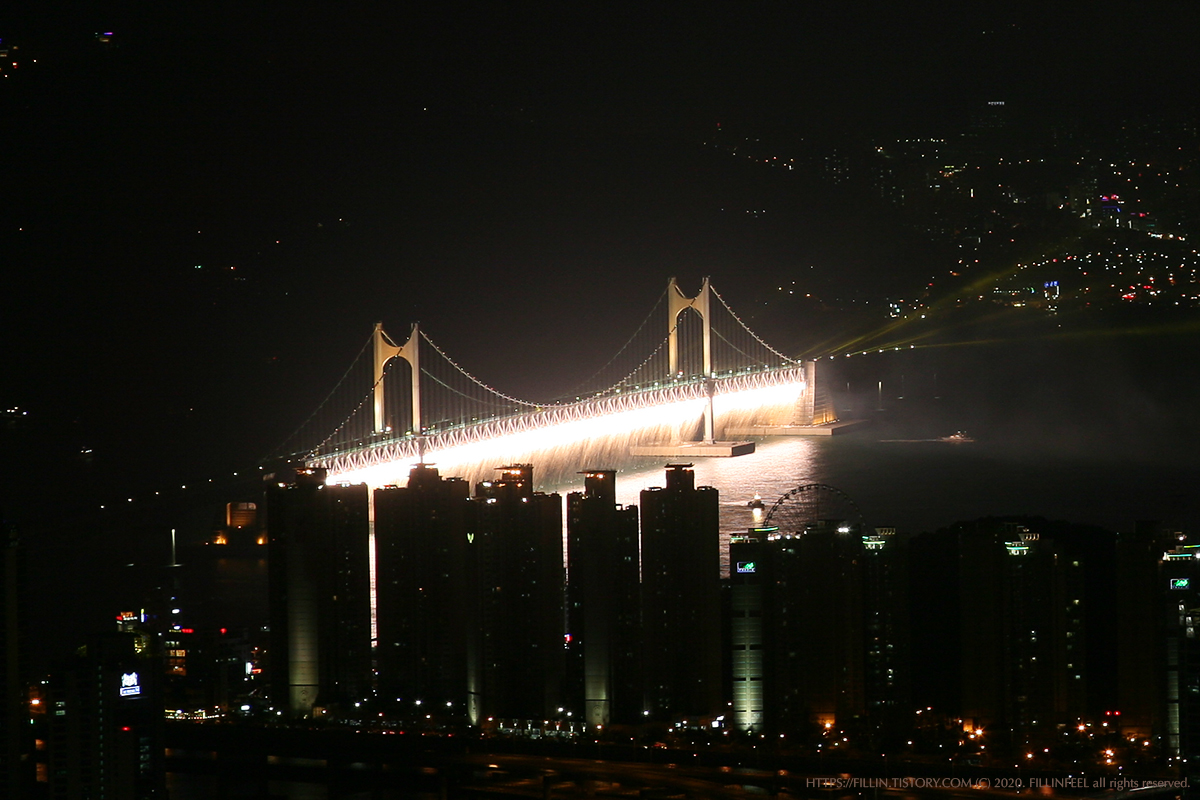 어느 덧 주변은 어두워지고 광안대교에 불이 들어왔다. 간간히 예비 폭죽이 한 두 발씩 올라왔는데, 불꽃의 빛과 소리가 도달하는 시간 차이가 무려 7초 정도 차이나고 있었다.