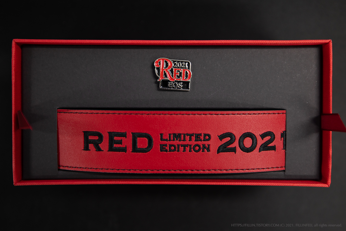상자를 여니 레드 스트랩과 뱃지가 예쁘게 놓여있었다. 스트랩은 인조가죽에 어깨와 마찰되는 부분은 벨벳 같은 소재로 되어 있다. 벨벳으로 추정되는 소재가 미끄럼 방지에 얼마나 효과가 있을지는 모르겠지만 대체로 무난한 듯 싶다.