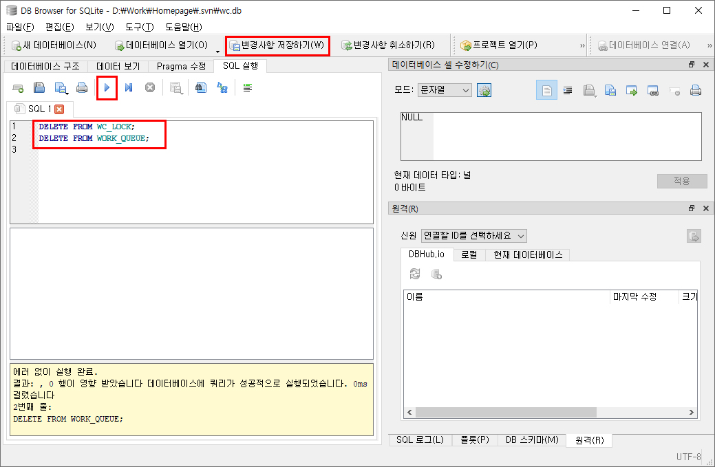 5. SQL 실행 탭으로 이동하여 다음과 같이 명령어를 입력 후 실행한다. 정상적으로 실행된 경우 하단에 에러 없이 실행 완료 라는 메시지를 받게 된다. 변경사항 저장하기를 클릭하여 마친다.