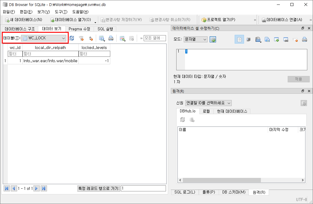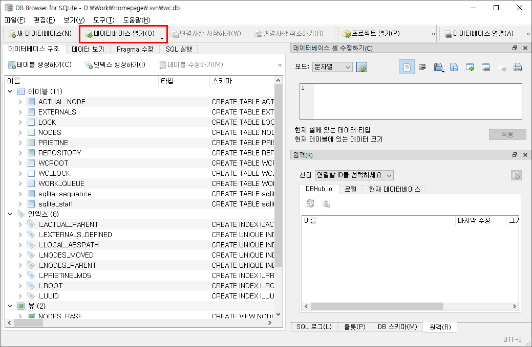 3. 프로그램이 실행되면 데이터베이스 열기를 클릭하여 문제가 되고 있는 프로젝트 내의 wc.db 파일을 연다. wc.db 파일은 작업 프로젝트 내 .svn 폴더 안에 위치해 있다.