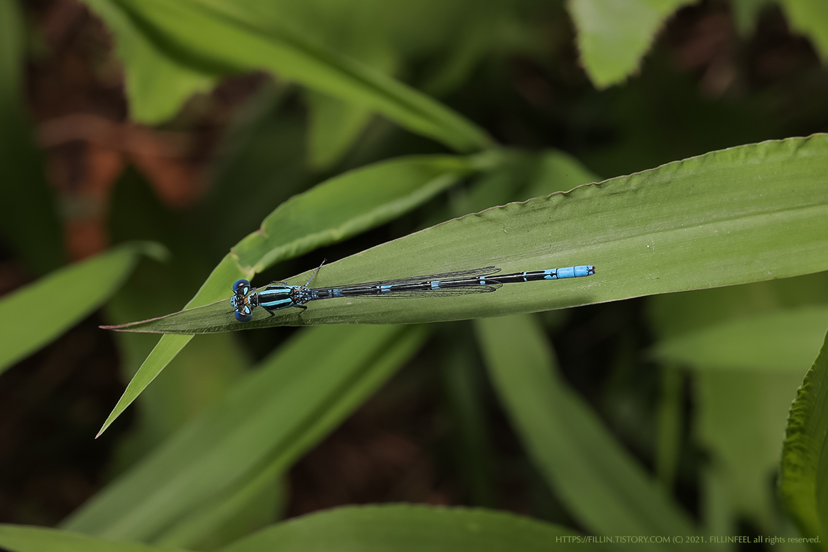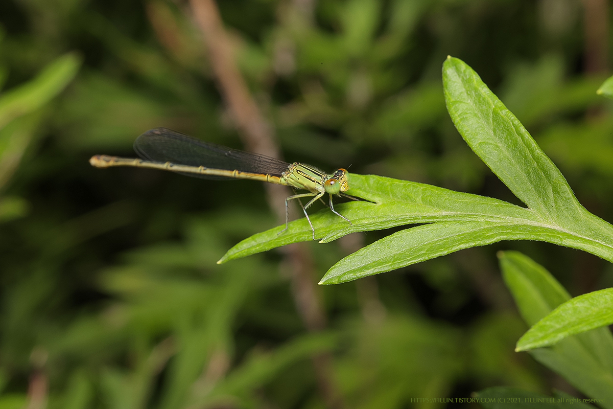 이번에 찾은 곤충은 실잠자리과에 속하는 왕실잠자리 이다. 사실 왕실잠자리라고 동정했지만 등줄실잠자리와 왕실잠자리의 구분이 어려워 틀릴 수도 있다. 수생식물이 많이 자라는 곳에서 흔히 볼 수 있는 잠자리 라고 하는데 회사 앞 풀숲에서 발견한 잠자리다. 실잠자리 라는 이름 처럼 배가 가늘고 긴 것이 특징이다. 실잠자리과에는 등줄실잠자리, 등검은실잠자리, 작은등줄실잠자리, 왕실잠자리 등이 있는데 이 구분이 쉽지 않다. 위에서 등을 내려다보고 무늬와 안후문(눈 뒤의 무늬)을 관찰해야 특정할 수 있게 된다. 윗쪽에서 바라본 모습으로 보아 왕실잠자리로 보인다. 길이가 대략 3cm 쯤 되고 배는 갈색과 초록색이 섞여 있고 윗쪽은 검정색 줄이 있다. 겹눈 안쪽에 녹색과 갈색빛이 섞여 있다.