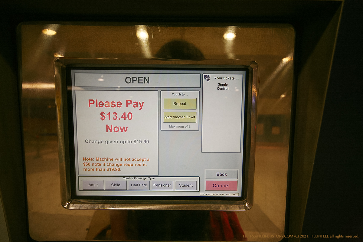 시드니 공항에서 시티로 가는 방법은 트레인을 이용하면 된다. 터치 스크린으로 되어 있는 승차권 구입기다. 왕복권이 없는 관계로 싱글로 끊고 Central 이나 서큘러키 등등 시티 내 어떤 역을 선택해도 가격은 변하지 않았다. 트레인을 타보면 알겠지만 금방 도착하는 거리다. 하지만 어느 나라에서나 그렇듯 공항에서 시티로 들어오고 나가는 트레인의 가격은 비싼 것 같다.