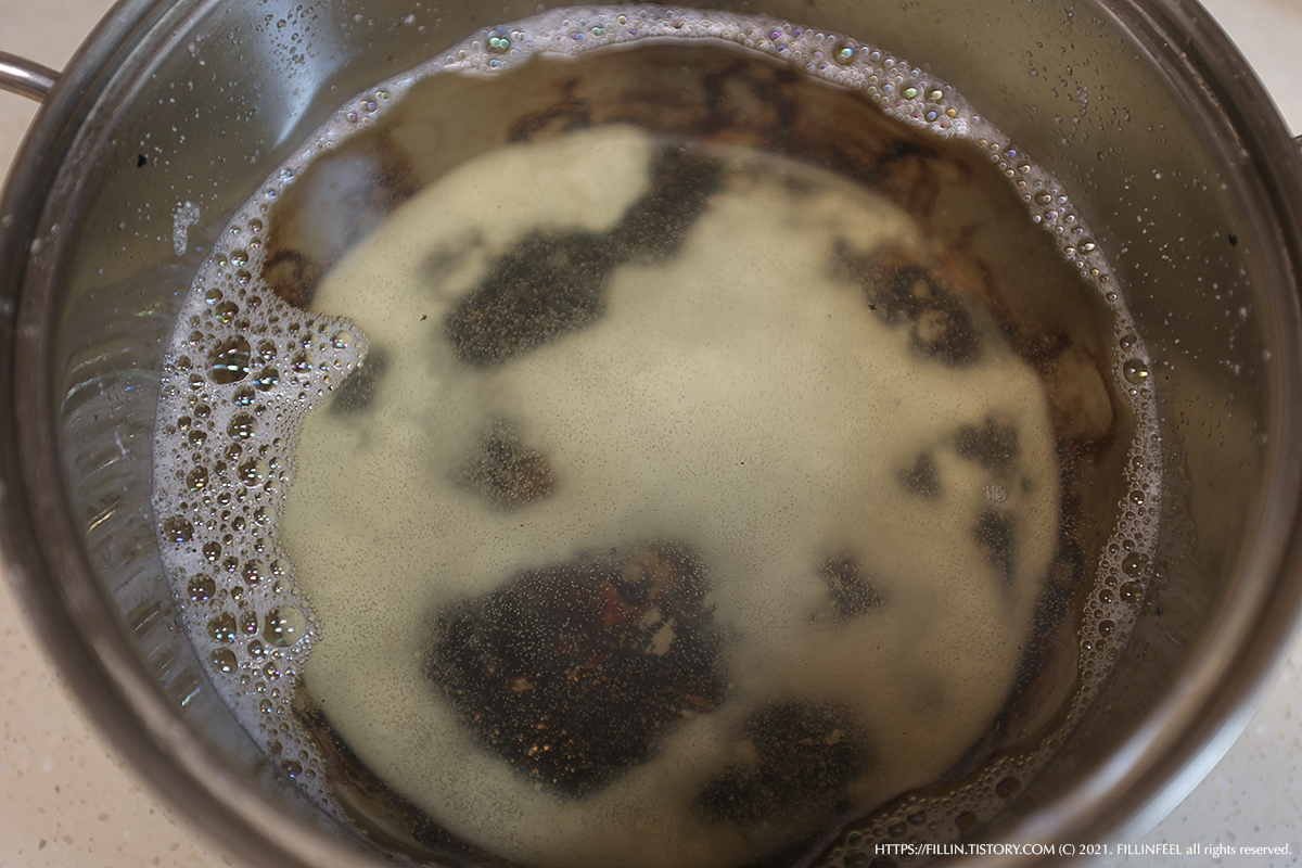 1. 탄 냄비에에 탄 부분이 잠길만큼 물을 붓는다.