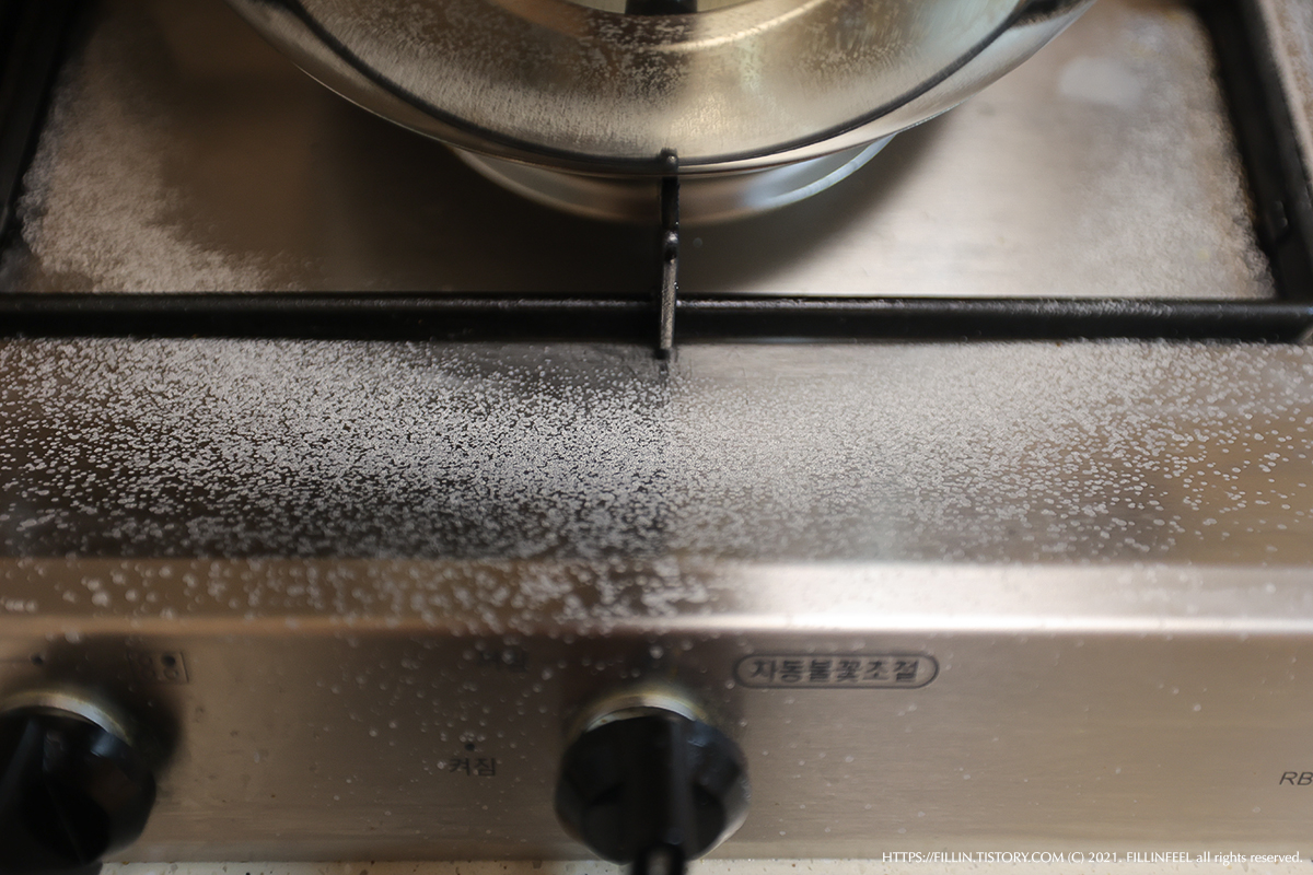 단 넘치는 대신 냄비 주변에 이렇게 하얀 가루가 잔뜩 묻는다. 베이킹 소다가 튀어서 생긴 것으로 보이는데 나중에 행주로 닦으면 깨끗하게 닦이니 크게 신경쓰지 않아도 된다.