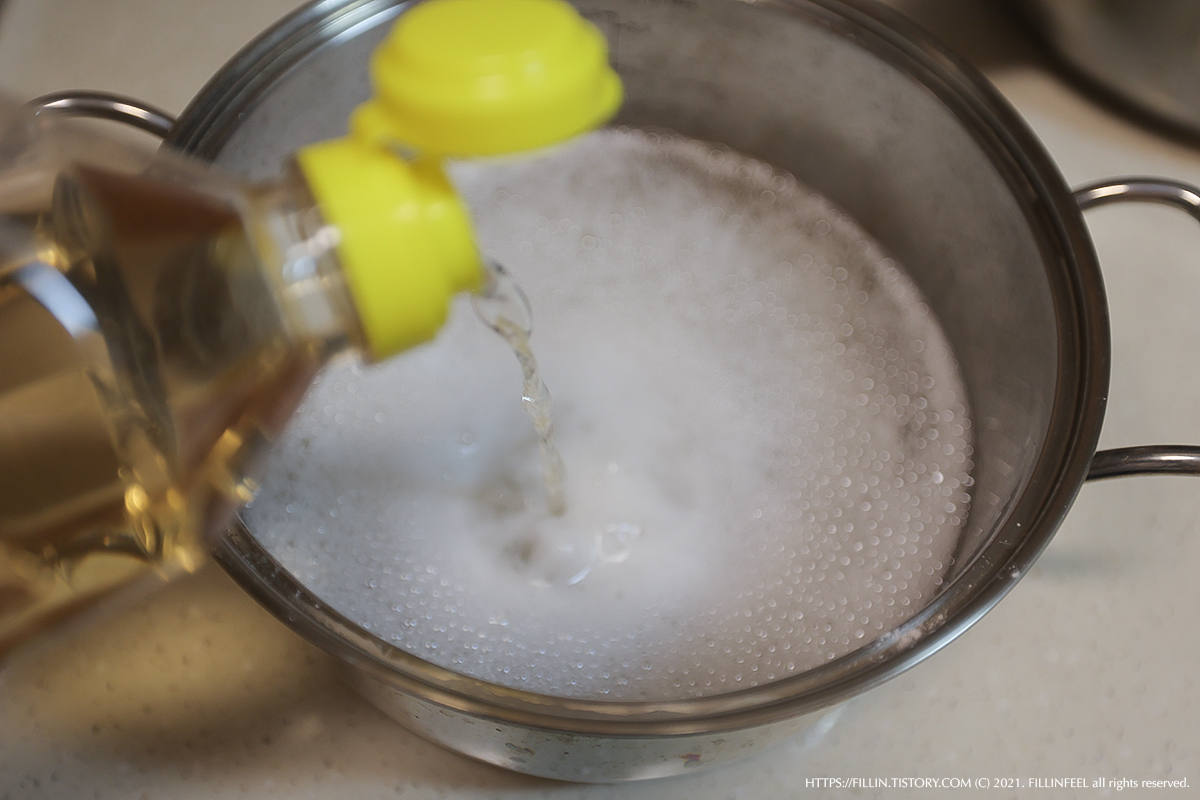 어느 블로그에서는 넘칠 수도 있다고 하는데 약불에서는 넘치는 일이 발생하지 않았다. 확실하진 않지만 베이킹소다와 식초의 비율이 다르면 넘칠지도 모르겠다는 생각을 해보게 된다.
