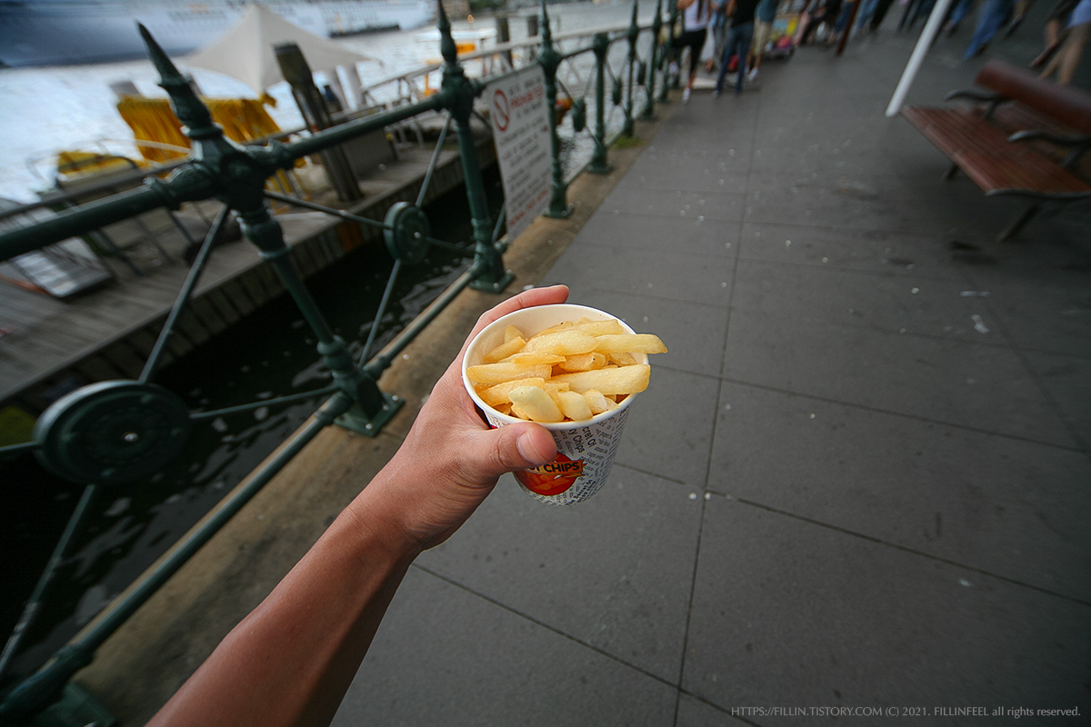 오페라 하우스에 가던 중 간식 거리가 필요해서 칩 한 컵을 샀다. 커피 자판기에 나올 것 같은 작은 종이컵 같아 보이지만 벤티 사이즈는 되는 종이컵이다. 조금 늦은 저녁까지 사진을 찍을 계획이라 가볍게 허기를 달랠 음식이 필요해서 사먹었다. 맛집도 찾아놓고 호주의 음식 문화도 경험을 했어야 했지만 이 당시 나의 여행은 그저 사진 촬영 여행에 가까웠다. 지금와서 생각하면 더욱 다양한 경험을 했더라면 어땠을까 싶은 아쉬움이 남는다.