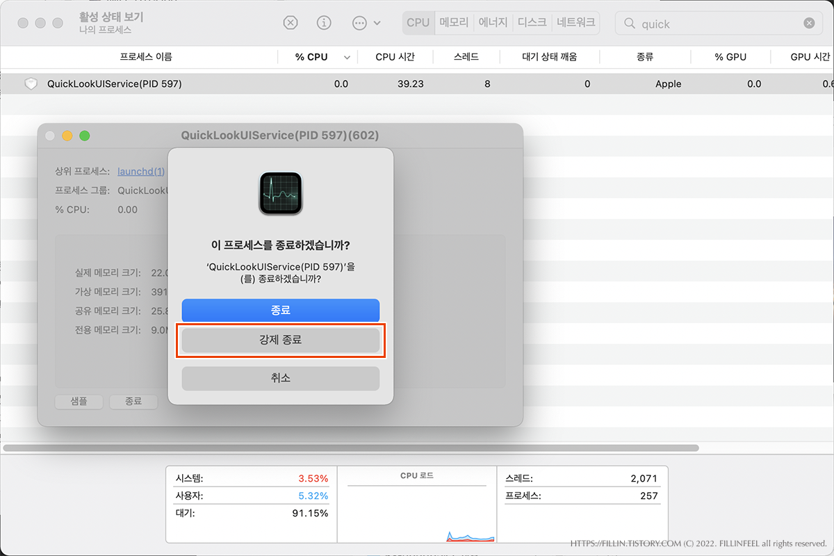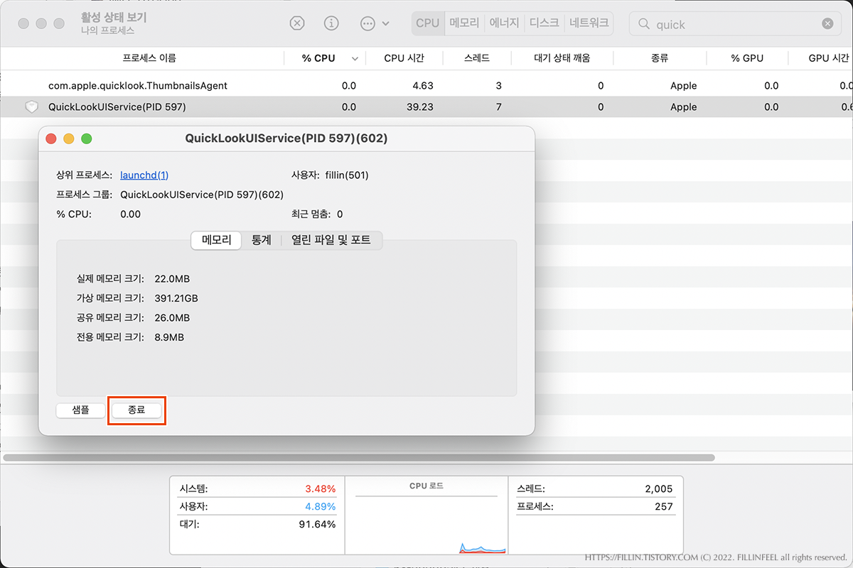 활성 상태 보기 창이 뜨면 우측 상단 검색란에 quick이라고 친다. 그러면 프로세스 이름 중에 QuickLookUIService(****)를 찾을 수 있다.