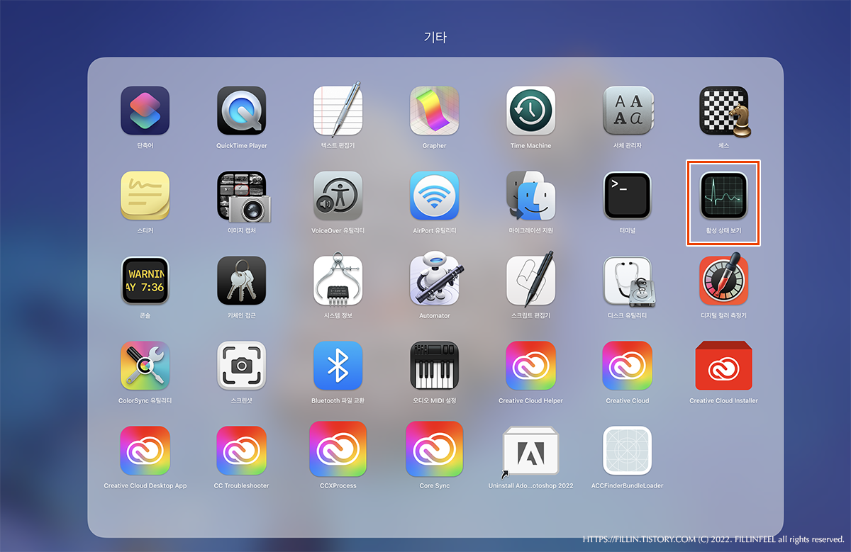 또는 트릭패드에서 네 손가락을 오므려 응용프로그램을 띄우고 기타 > 활성 상태 보기를 클릭해도 된다.