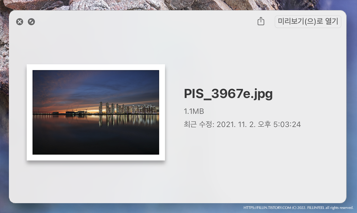 파인더에서 이미지, 영상, 문서 등의 파일을 서드파티 프로그램 사용없이 스페이스바를 누르는 것으로 미리보기를 할 수 있는 기능이다.