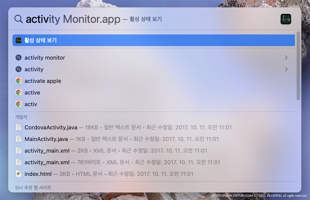 실행 방법은 단축키를 변경하지 않았다면 Command + Space를 눌러 창을 열고 "acti" 라고 치거나 "활성" 이라고 치면 위와 같이 활성 상태 보기가 나타난다.