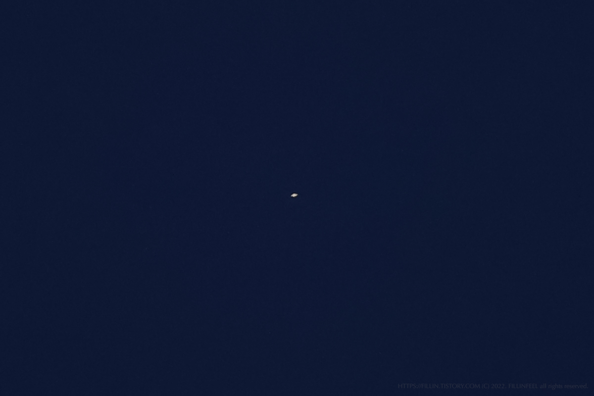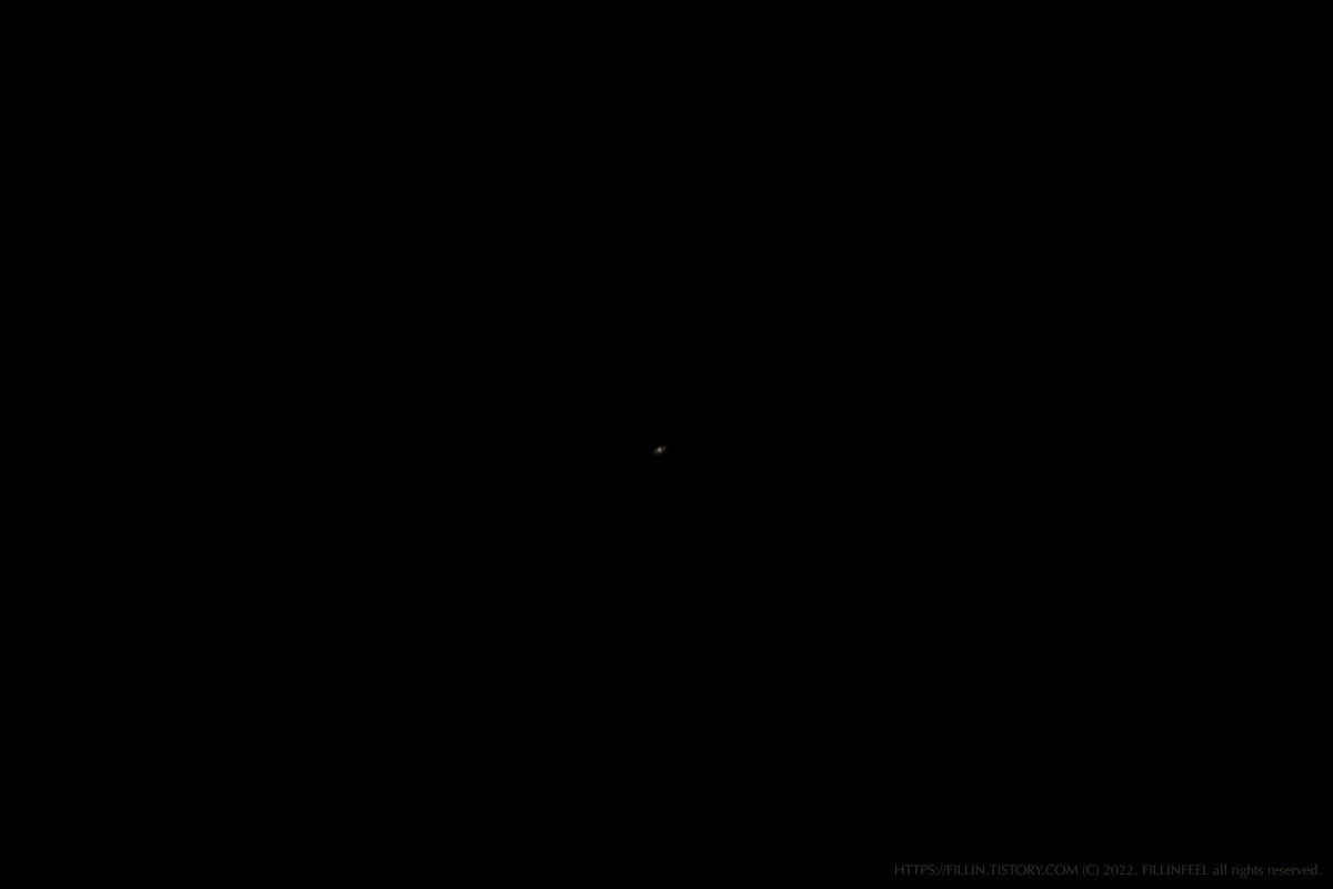 드디어 대망의 토성이다. 화성보다도 더 작게 보이지만 눈 부릅뜨고 자세히 보면 토성의 고리도 보인다. 솔직히 이런 사진을 올리는 것 자체가 조금 민망하긴 하지만 어디까지나 RF100-400 렌즈로 볼 수 있는 정도가 어느 정도인지 확인하기 위함이니 철면피를 조금 깔아보려고 한다. 사진으론 너무 희미하게 나왔지만 R6 라이브 뷰를 10배 확대해서 보면 토성의 모양이 제법 선명하게 잘 나타난다. 바람이 많이 부는 날 아파트 고층에서 찍다보니 흔들림 때문에 선명함이 덜하지만 밖에 딱딱한 곳에 삼각대를 차려포 하면 조금 더 선명한 이미지를 얻을 수 있지 않을까? 라는 생각을 해본다.