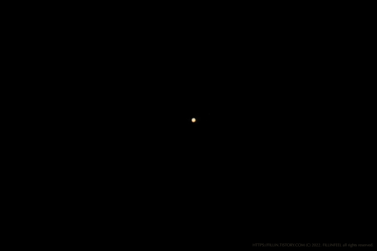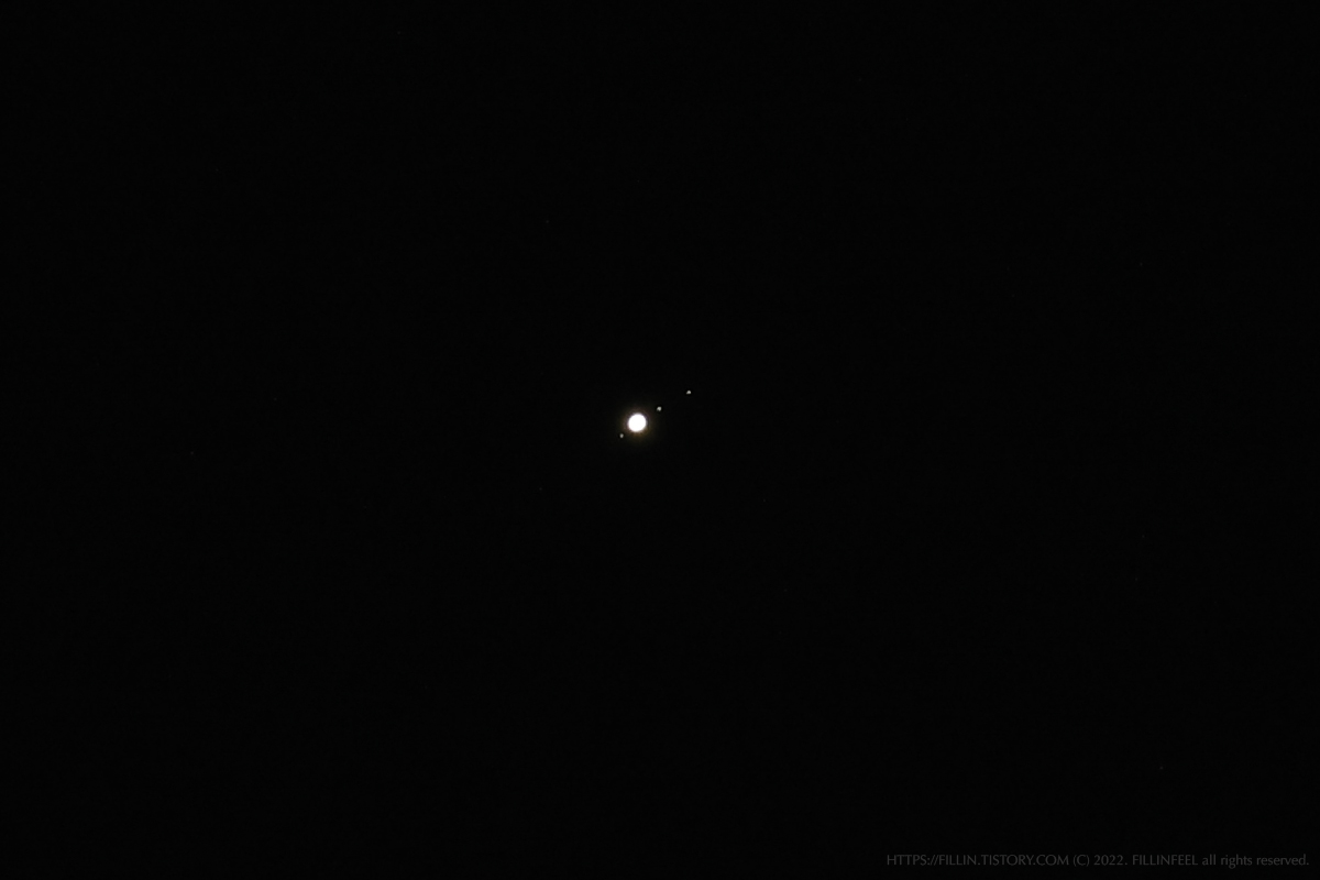 까만 밤 하늘에 꽤 밝게 빛나던 점. 그 점을 400mm로 촬영하고 100% 크롭도 했지만 그래도 점 하나가 보인다. 믿기 어렵겠지만 목성이다. 어딜봐서 목성이야? 라고 할까봐 다음 사진을 준비했다.