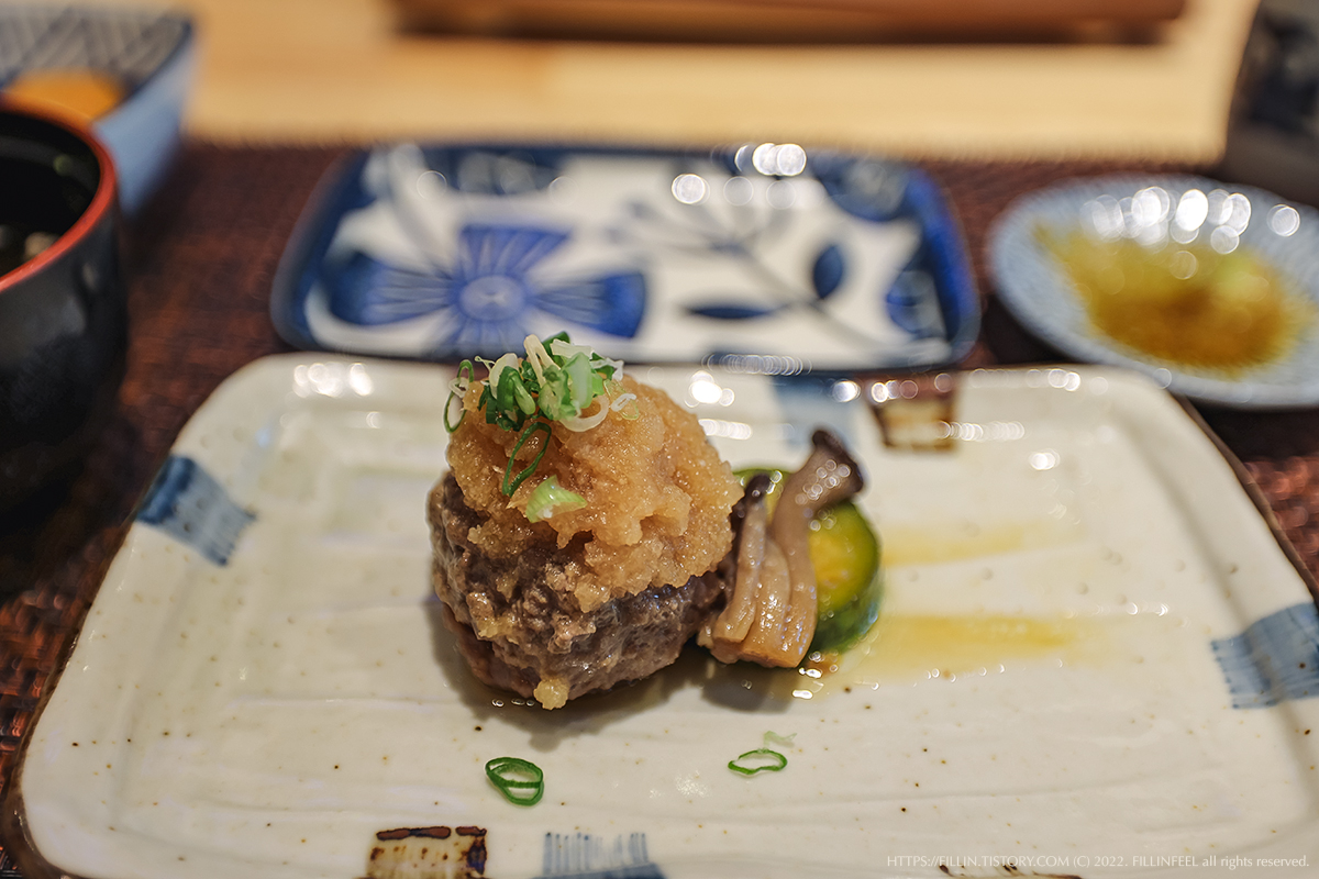 스시를 먹던 중에 일품요리가 나왔다. 함박스테이크가 나왔는데 맛은 괜찮았는데 갈린 무의 조합이 물음표를 던지게 만들었다.