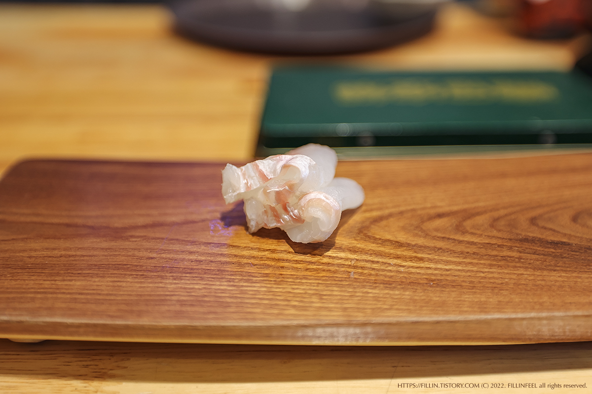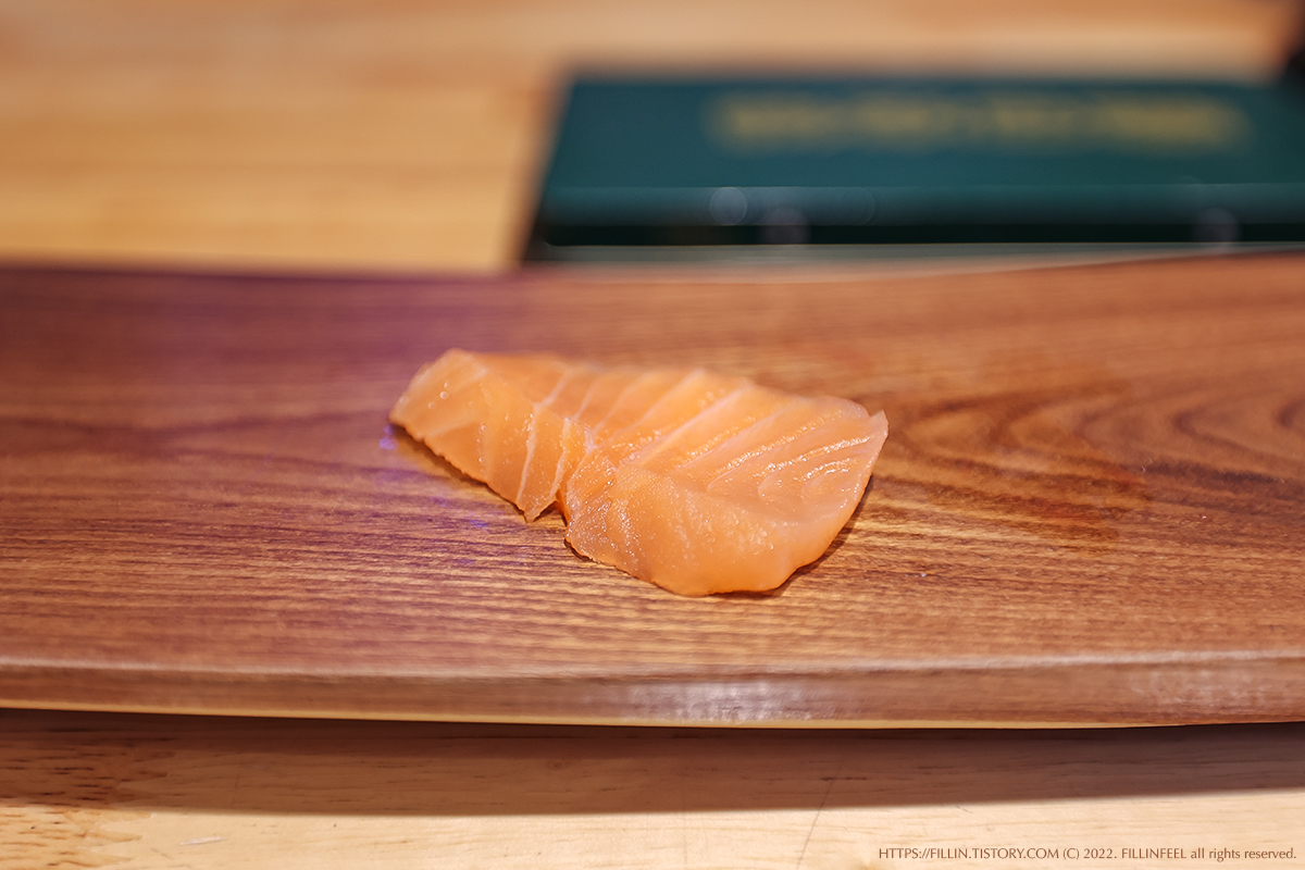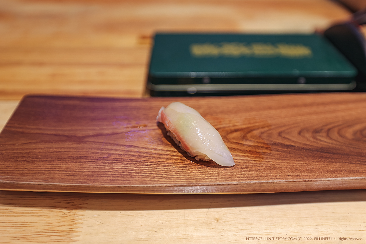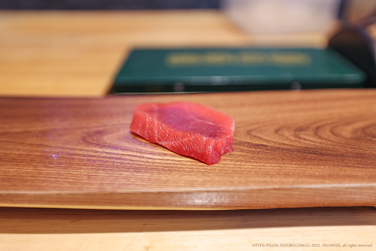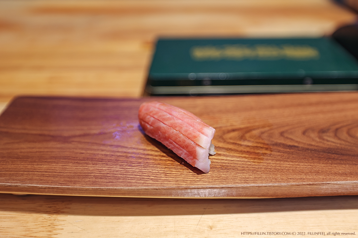 이 날 최고의 초밥을 꼽으라면 바로 혼마구로(참다랑어) 대뱃살을 꼽겠다. 참치에서 느껴지는 풍부한 풍미와 부드럽게 녹으면서 기름진 부위의 식감까지 무엇하나 빠질 것 없는 훌륭했던 초밥이었다. 네타 자체가 최고급인데 맛이야 말해 뭐해. 보기만 해도 맛있다는 생각이 드는 초밥이다.
