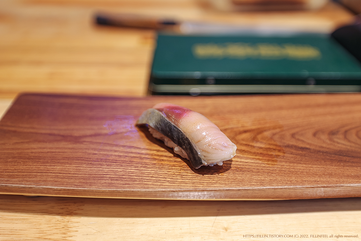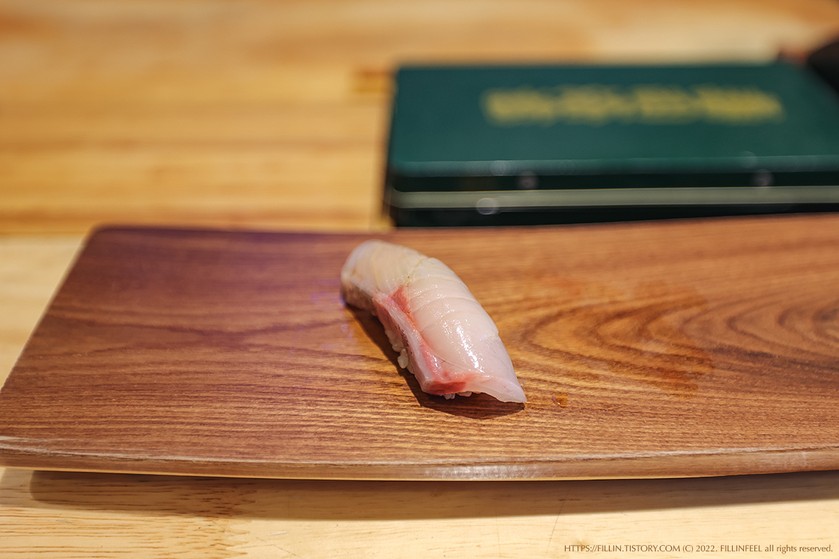 방어라고 하면 겨울철에만 먹는 회 라고만 생각했지 여름이 제철인 방어가 있는 줄도 몰랐다. 처음 먹어본 잿방어인데 괜찮다는 생각을 계속 하게 만든 스시였다.