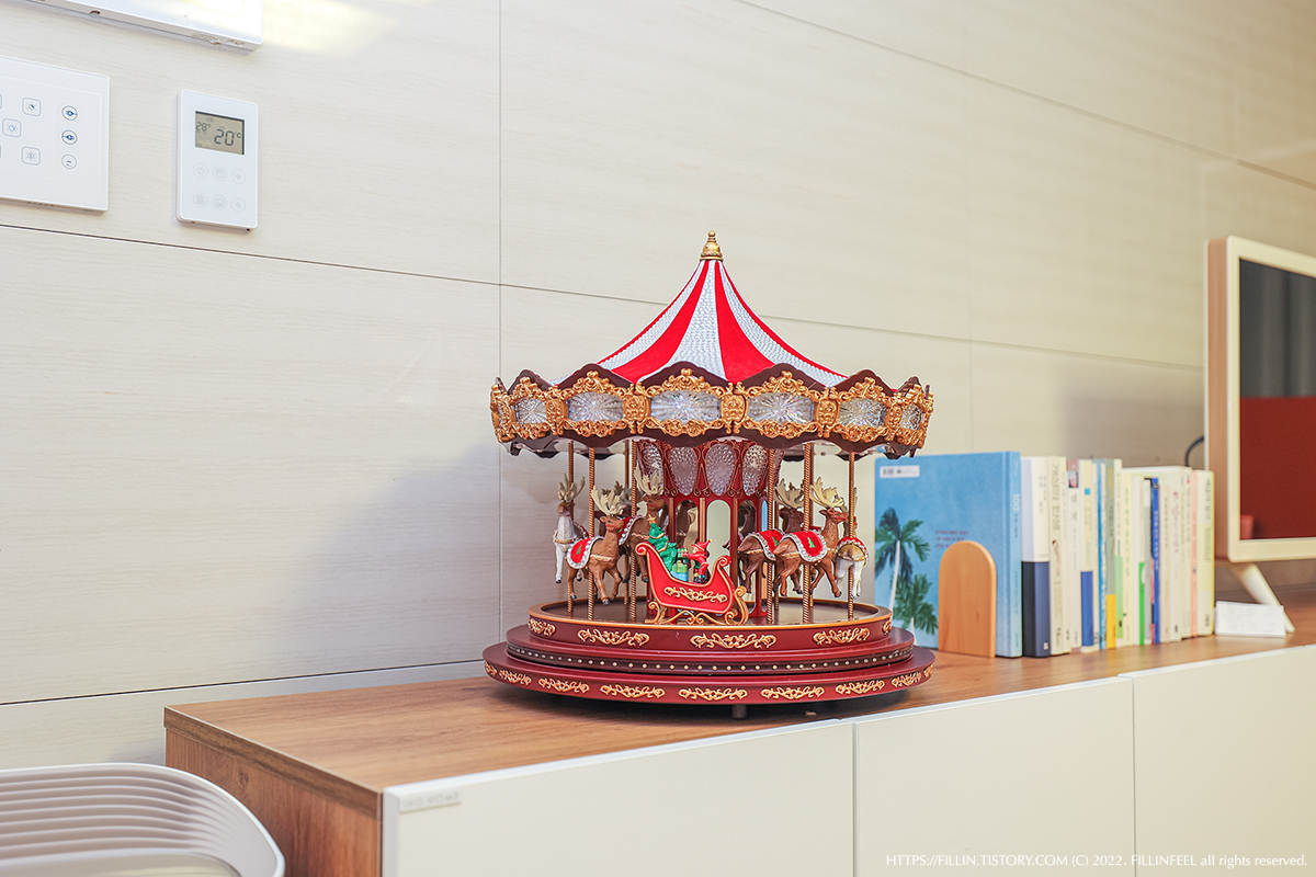 점등식. 거실 전등을 끄고 회전목마 오르골에 전원을 넣자 오르골 소리와 함께 노란 조명을 비추면서 회전목마가 힘차가 돌기 시작했다. 가족 모두 너도나도 예쁘다고 박수치며 난리들이다. 예쁘고 고급진 모습에 비해 약간 싼티나는 오르골 소리가 거슬리긴 하지만 예뻐서 그냥 멍하니 쳐다보게 된다. 개인적으로 오르골은 아주 작게 틀어두거나 꺼두는 것을 추천한다. 오르골을 꺼두면 회전목마 돌아가는 소리가 거슬리지 않는 소음으로 나쁘지 않게 들려온다.