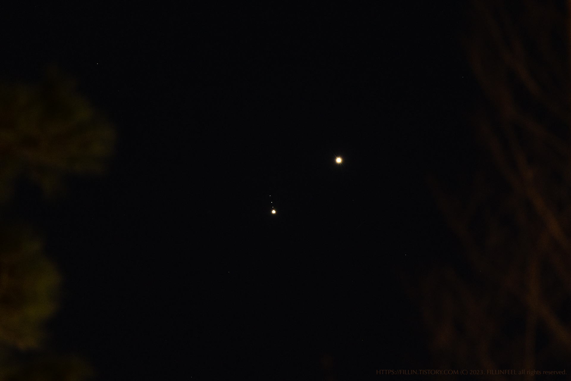 서쪽 하늘을 올려다보니 밝게 빛나는 두 점이 있었다. 겉보기 등급이 평균적으로 금성(-4.6), 목성(-2.9)라서 더 밝게 빛나는 게 금성이란 것을 알 수 있었다. 프레임 속에 이 모습을 담아두고 싶은 마음이 급해졌다. 갖고 있는 RF100-400 렌즈로는 목성의 표면이 나타나지 않기 때문에 목성의 위성까지 한 프레임에 담는 것을 목표로 노출을 올려보았다. 그리고 나타난 목성의 위성들.
