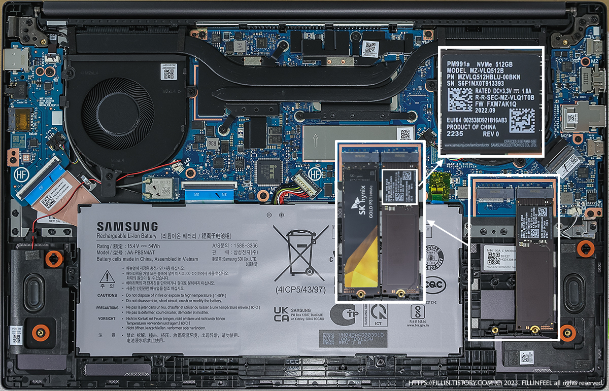 방열판을 열면 SSD슬롯이 두 개가 보인다. M.2 NVMe 2280 규격을 사용하는 SSD라면 장착이 가능하다. 기존에 장착된 SSD는 삼성에서 만든 PM991a MZ-VLQ512B 제품이고 성능이 듣보잡 SSD에 비해 못한 결과가 여러 리뷰에 나와 있다. 조금 더 빠른 읽기/쓰기를 원한다면 추가 장착하는 SSD를 메인으로 하고 기존 SSD를 서브로 하는 것도 방법이라 생각한다.