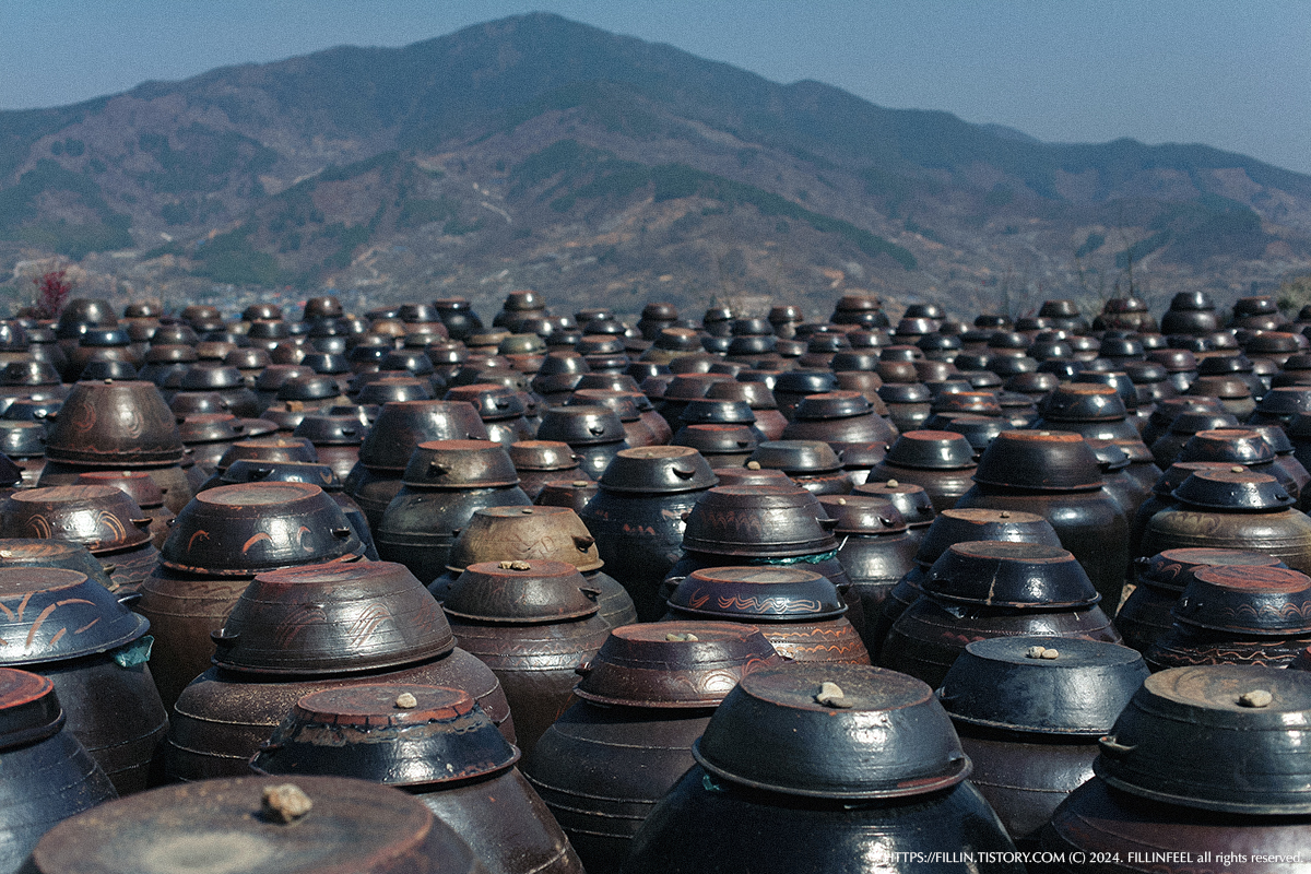 그렇게 구경하며 내려오다 보면 수 많은 전통옹기의 항아리가 줄지어 선 모습을 만날 수 있다. 햇살과 매실향에 익어가는 모습이다.