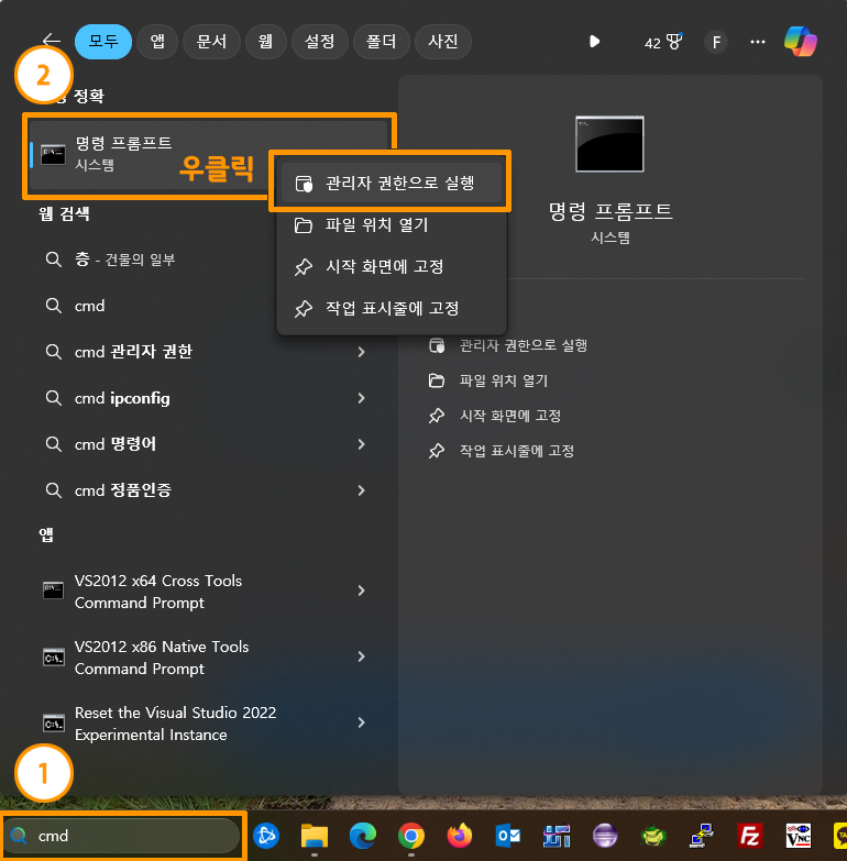 검색창에 cmd 라고 입력 후, 명령 프롬프트에서 우클릭 하여 관리자 권한으로 실행을 누른다.