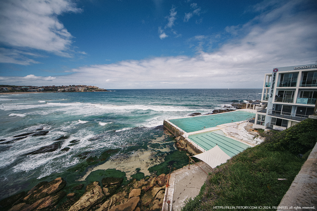 그렇게 계속 오르다 보면 연중 상시 운영되는 본다이 아이스버그스 수영장(Bondi Icebergs Pool)을 만날 수 있다. 바닷가에 수영장? 바닷가 바로 옆에 있는 수영장은 아주 이색적인 분위기로 느껴진다. 잔잔한 물에서 수영을 즐기고 있는 사람, 그 옆으로 파도가 부서지고, 부서지는 파도 소리를 가만히 듣고 있으면 좋다! 라는 생각이 절로 난다.