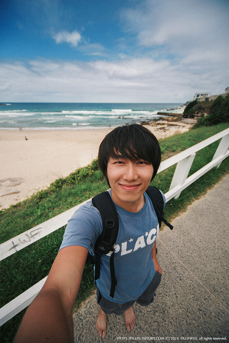 신발을 벗고 고운 모래도 밟아보고 바닷물에 발도 살짝 담가본 후, 본다이 비치를 높은 곳에서 내려다 보고 싶어 이동하던 중에 셀카를 남겼다. 호주에서의 컷트는 비싸긴 엄청 비싸고, 머리 스타일도 맘에 들지 않는다는 말을 워낙 많이 들어왔던 터라 장발 인생을 살고 있었다.