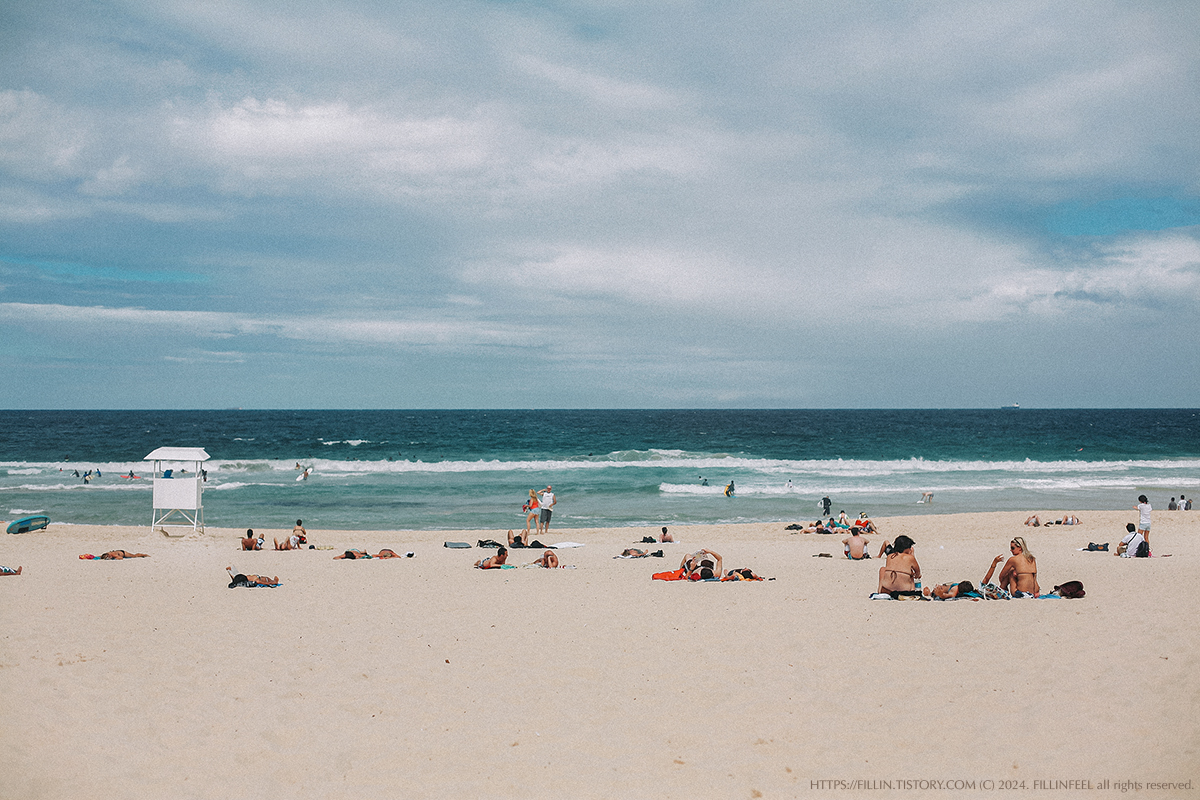 비치에는 대부분 비키니를 입고 오일을 바르며 태닝을 즐기고 있었고, 좋은 파도 덕에 많은 서퍼들이 파도를 타고 있었다. 나도 짐이 좀 없었으면 바닷물에 몸을 풍덩 던지고 싶었지만 혼자 떠난 여행이라 비싼 카메라를 모래밭에 두고 뛰어들 수는 없었다.