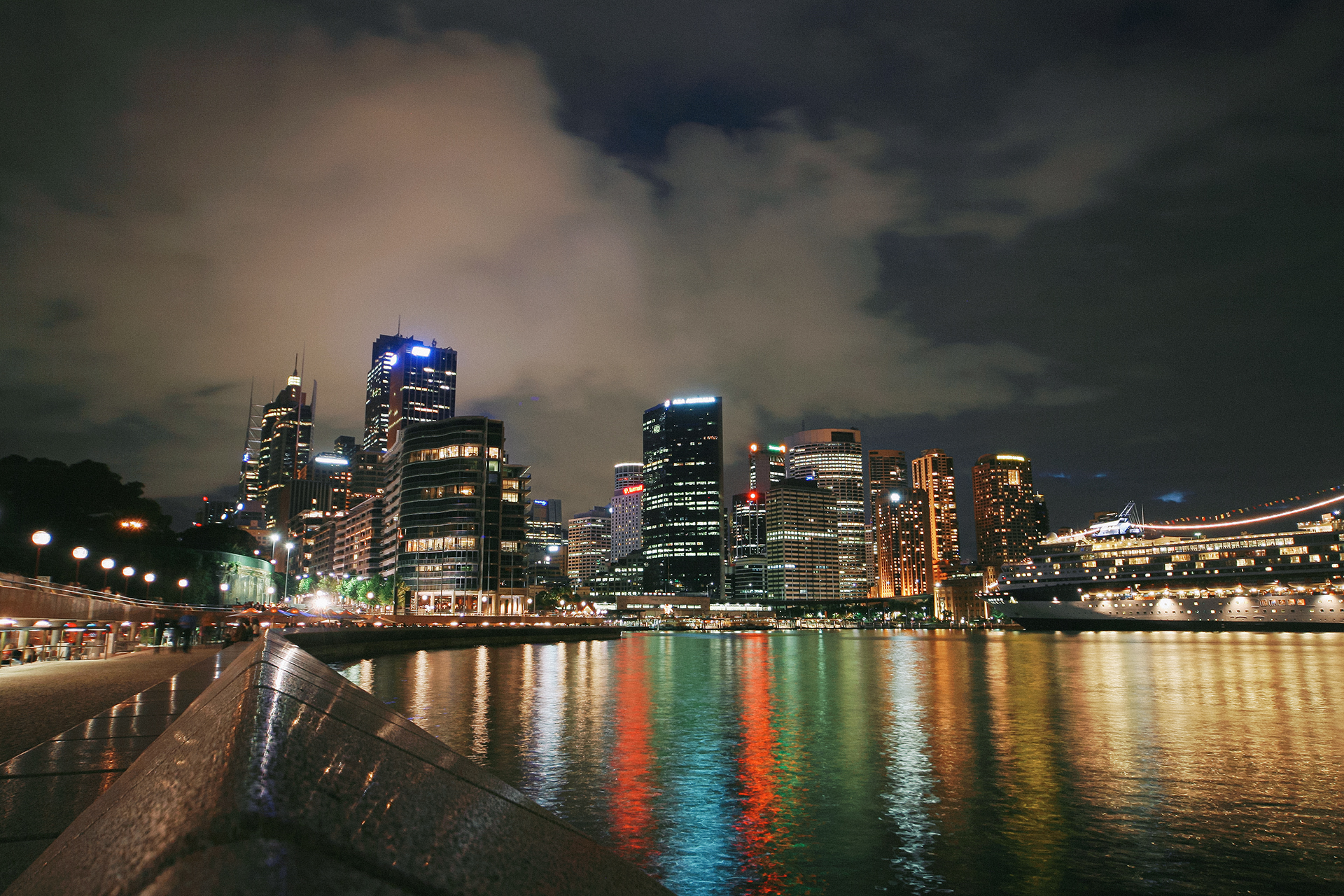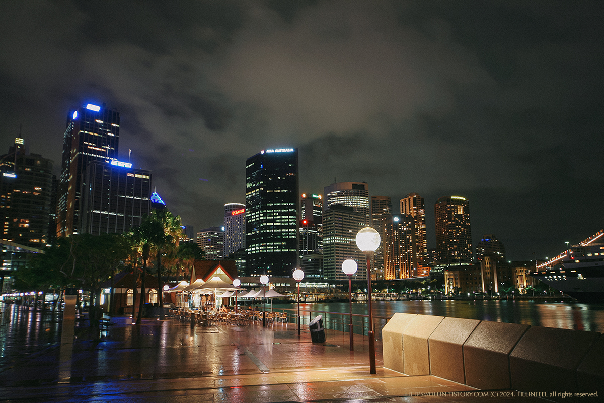 이번엔 시드니 시티와 서큘러 키 모습이다. 낮게 깔린 구름이 도심의 불빛 때문에 밝게 보인다. 그리고 저 멀리 구름 사이로 아직 채 어두어지지 않은 하늘 일부가 파랗게 조금 보인다. 내가 기대했던 하늘이 저 구름 뒤의 하늘이었는데..