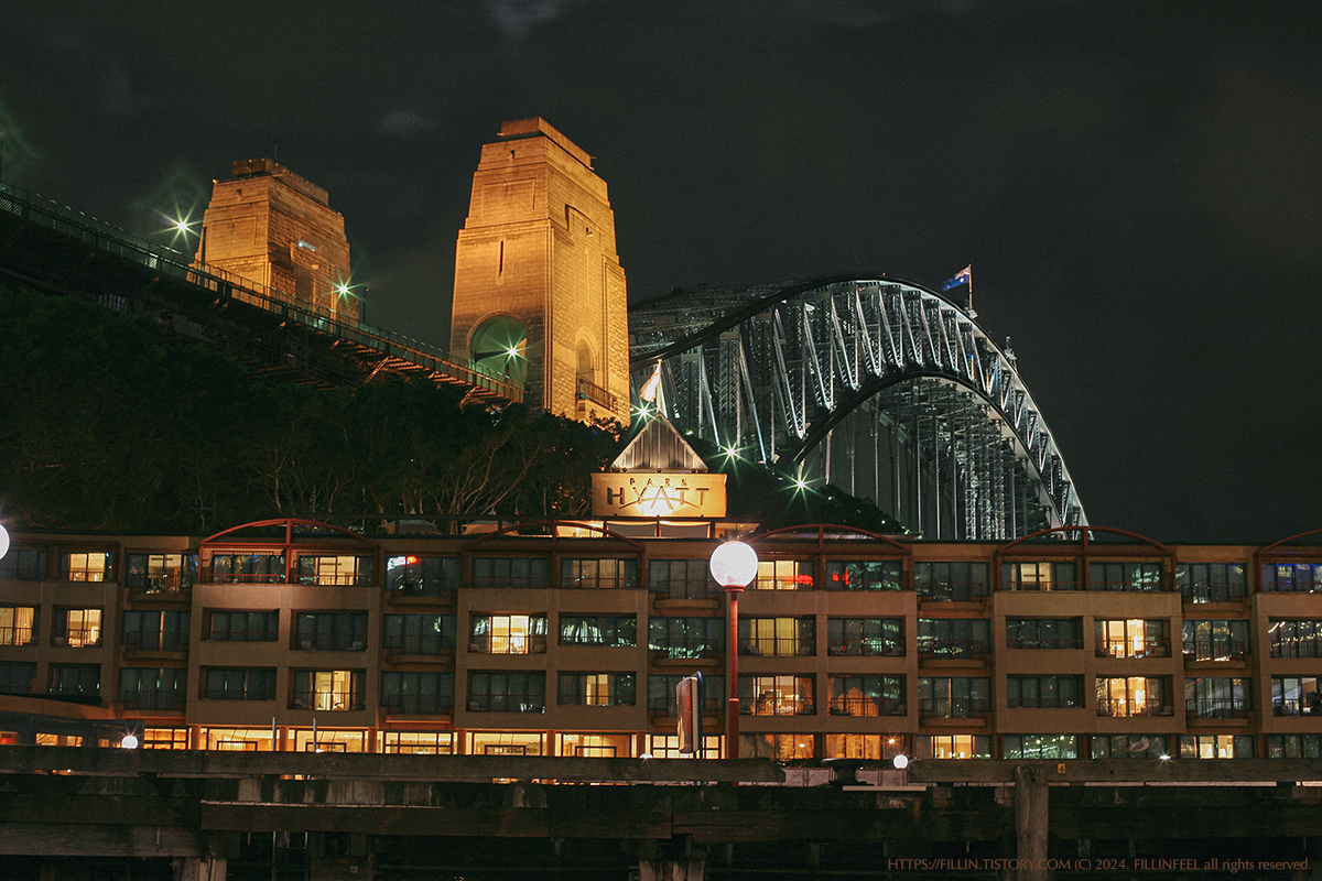 이렇게 파크 하얏트 시드니 호텔과 하버브리지가 함께 보인다. 4층 짜리 앉은 건물의 호텔이긴 하지만 5성급 호텔이고 창문을 통해 오페라 하우스의 뷰를 가진 저 호텔이 정말 좋아보였다. 그 뒤로 하버브리지와 함께 오렌지 조명의 파이론이 꽤나 웅장하고 인상적인 모습을 보인다. 다시 시드니에 온다면 저 Hyatt호텔에 머물고 싶다. 물론 1박에 100만원이 넘는 비싼 호텔이라는 게 함정이다. 아침에 창문으로 보이는 일출이 오페라 하우스와 함께 비치는 상상을 해본다.