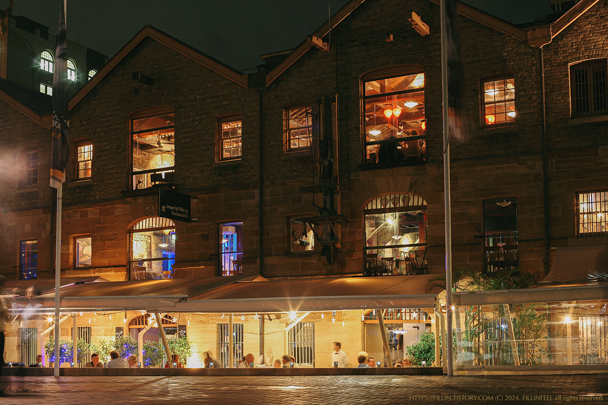 그렇게 오페라 하우스 주변을 찍다가 Wharf를 지나고 Campbells Cove 쪽으로 발걸음을 옮겼다. 내 블로그 시드니 여행 3부에서 봤던 그 곳이다. 이 곳 또한 멋진 야경일 것 같아서 와본 건데 역시나 멋이 있다. 아래 레스토랑을 제외한 2층 부터는 숙소일 것이라 생각했는데 저 곳 또한 레스토랑으로 보인다. 이 레스토랑이 꽤 좋아보였던 이유는 바로 아래에 있다. 하버브리지와 오페라 하우스가 멋지게 보이는 뷰를 갖고 있었기 때문이다.
