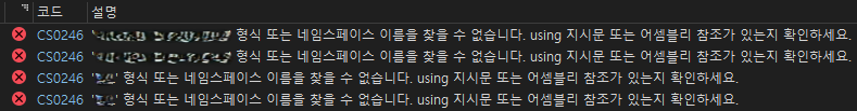 CS0246 형식 또는 네임스페이스 이름을 찾을 수 없습니다. using 지시문 또는 어셈블리 참조가 있는지 확인하세요.