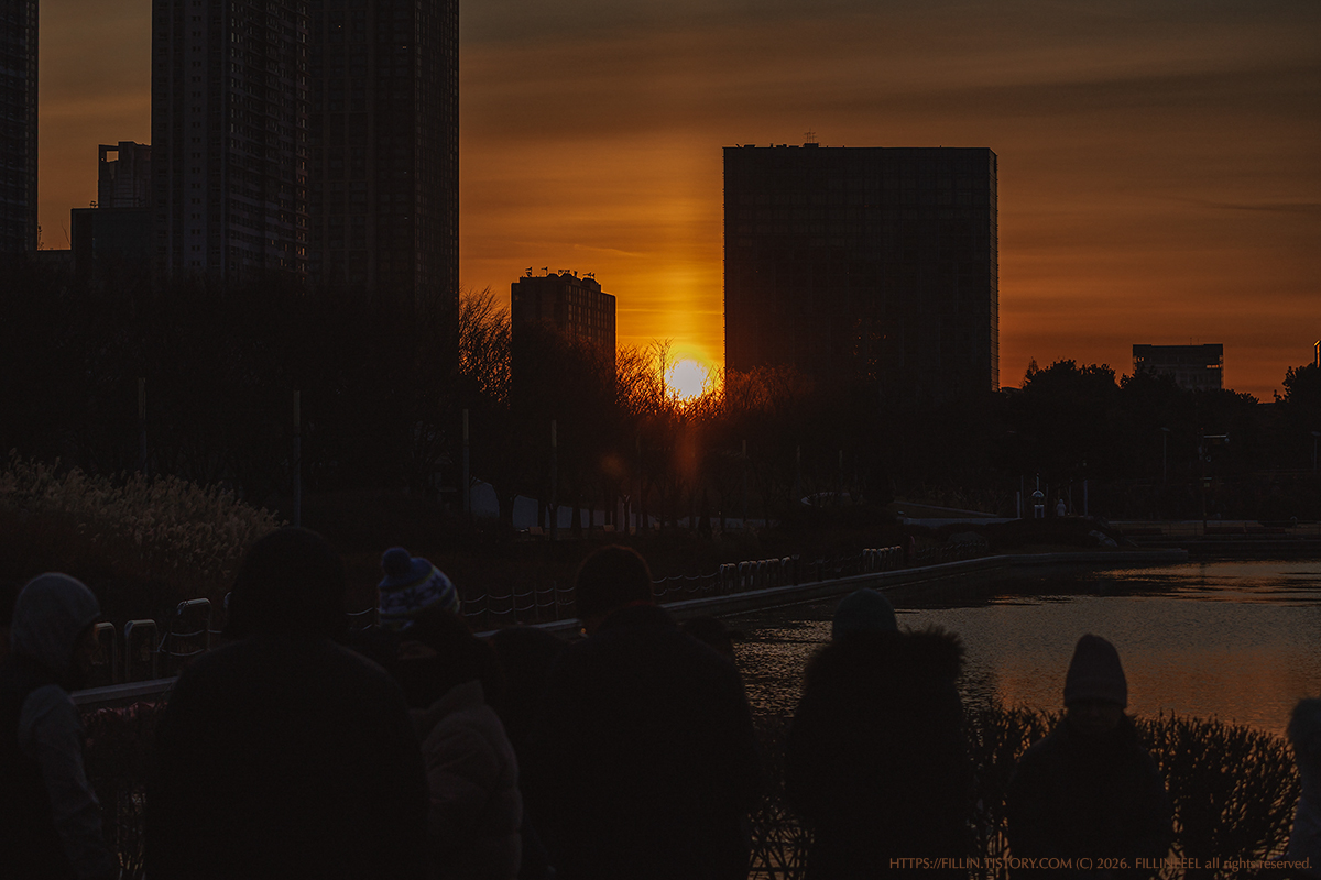 집 밖을 나서자마자 매립지 특유의 매서운 바람이 얼굴을 때린다. 괜히 송베리아 송베리아 하는 게 아니다. 어디서 해를 볼까 고민하다 발걸음은 자연스럽게 집 근처 센트럴파크로 향했다. 처음에는 호수 1교 다리 위에서 자리를 잡으려 했다. 하지만 막상 서보니 일출각이 제대로 나오지 않았다. 마음이 급해졌다. 그때, 저 멀리 공원 호수 다리 근처에 군집해 있는 사람들의 모습이 보였다. '아, 저기로 가야겠다!' 싶은 마음에 부리나케 달려갔다.